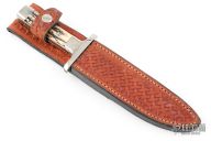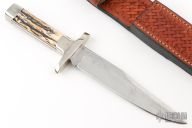 This knife by Kellie Hagwood features a satin finished blade with false top edge, .190" blade stock and 1.250" blade depth, full tang construction. The handle has a nickel silver guard, dovetailed nickel silver bolsters front and rear, stag scales. Comes with a hand tooled brown leather sheath. Has some light scatches and patina, otherwise excellent condition.