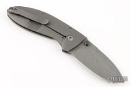 This Alpha by Tom Krein features an acid wash finished drop point blade with dual thumbstuds and swedge. The handle has an acid and tumble finish titanium frame, matching tip up clip, and titanium backspacer. Nice lock up, detent and blade seating. Blade has scratches and stains, marks on the clip, good condition otherwise.