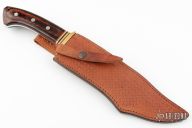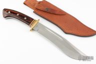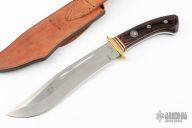 This Bowie from Rigid Knives features a satin finished blade with a false top edge and fullers, .217" blade stock and 1.750" blade depth, hidden tang construction. The handle has a brass guard, dymondwood scales over an aluminum frame, and red/black/brass spacers. Comes with a brown leather sheath. Has a couple light scratches, otherwise excellent condition.
