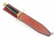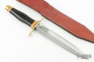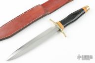 This dagger features a satin finished double edged blade with .226" blade stock and 1.222" blade depth, hidden tang construction. The handle has a brass guard and butt, dymondwood grip with black and yellow paper micarta spacers. Comes with a brown leather sheath. Has some light oxidation spots, otherwise excellent condition.