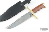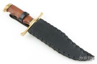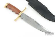 This bowie features a satin finished blade with nearly sharpened top edge, .249" blade stock and 1.755" blade depth, hidden tang construction. The handle has a brass guard and butt with a wood grip and black spacers. Comes with a black leather sheath. Has scratches and pitting, fair condition.