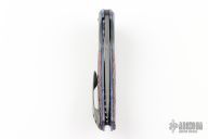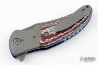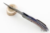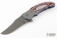 This Silver Fox Flipper from Allen Elishewitz features a Damascus recurve blade with swedge and flipper. The handle is comprised of darkened bolsters, red/white carbon fiber scales, textured and anodized titanium liners and satin barrel spacers, tip up pocket clip. Nice detent, lockup and blade seating. Includes padded velcro case, with maker's patch. Excellent condition.
