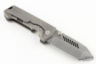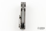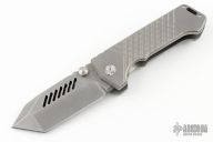 This Alpha Beast from PMP Knives features a stonewashed blade with a notched thumbrest and dual thumbstuds, .390" blade stock.  The handle features a bead blasted titanium frame with a matchig tip up pocket clip and backspacer with lanyard hole. Includes original box and coin. Excellent Condition.  #042 of 175