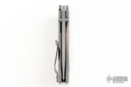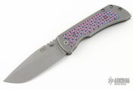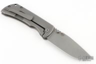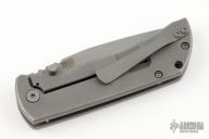 This MAC2 features a stonewashed drop point blade with dual thumbstuds and a notched thumbrest.  The handle features a stonewashed titanium frame with Patriot G-10 inlay, a titanium tip up pocket clip.  Includes box and papers. Excellent condition.