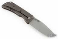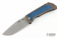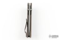 This MAC2 features a stonewashed drop point blade with dual thumbstuds and a notched thumbrest.  The handle features a bronze stonewashed titanium frame with black/blue G-10 inlay, a titanium tip up pocket clip.  Includes box and papers. Excellent condition.