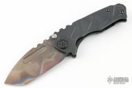 This Micro Praetorian from Medford Knife and Tool features a Vulcan finished blade with notched thumbrest and ambidextrous thumb groove. The handle has a DLC Stained Glass carved titanium frame with anodized titanium tip up pocket clip. Stainless steel backspacer doubles as a glass breaker. Comes with original box, zippered case and papers dated Feb 15, 2024. Excellent condition.
