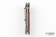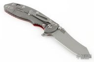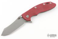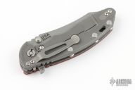This XM-18 by Rick Hinderer features a working finished blade with notched thumbrest and flipper. The handle has a red G-10 front scale, working finished titanium frame, and a tip up or down reversible titanium clip and filler tab, lanyard hole at the butt. Comes with original box and extra hardware. New condition.