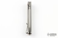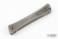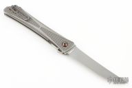 This custom Bones flipper from Jeff Park features a hand rubbed, satin finished 154CM blade with flipper. The handle has a milled and two-tone anodized titanium frame, backspacer and tip up clip. Blade is centered when closed, flips well, and locks up with no play. Comes with a soft pouch. Has some light carry marks on the frame and clip, otherwise excellent condition.