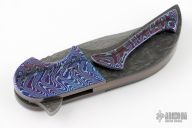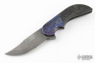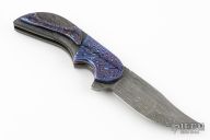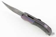 This Barely Legal liner lock flipper by Jeff VanderMeulen is #91, it features a Rob Thomas Reptilian Damsacus multi-ground blade with notched thumbrest and flipper. The handle has Boomerang MokuTi bolsters, backspacer and tip up clip, marble carbon fiber scales, tumble finished titanium liners. Clip and front bolster have hidden screws. Nice detent, lockup and blade seating. Comes with nylon zippered case and COA. Has a few very fine scratches, otherwise excellent condition. Dated 6-2016 inside backspacer.