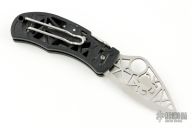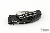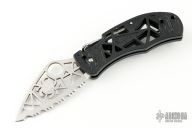This Q Knife front-lock folder by Spyderco has a skeletonized satin finished stainless steel fully serrated blade with unique, clip-style front lock. Handle is black skeletonized polymer with 4-way reversible clip and lanyard hole. Comes with original box and papers. Excellent condition.