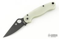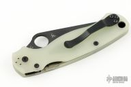 This G81GM4BKP2 Paramilitary 2 by Spyderco features a black finished clip point blade with thumb hole, notched thumb ramp and choil. The handle has textured jade G10 scales over a stainless steel subframe and lockbar. A 4 way adjustable milled titanium pocket clip and lanyard tube in pommel. Includes original box and paperwork. Excellent condition.