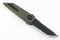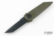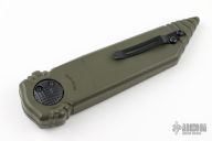 This Dreddlock model sports a green handle with a bullseye laser etching and a CPM-S30V steel blade with a black cerakote finish. The top edge of the knife has been sharpened.