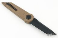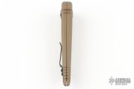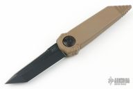 This Dreddlock model sports a coyote handle with a bullseye laser etching and a CPM-S30V steel blade with a black cerakote finish. The top edge of the knife has been sharpened.