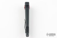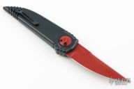 This Phoenix model sports a black handle with a phoenix laser etching and a CPM-S30V steel blade with a red cerakote finish. The top edge of the knife has been sharpened.