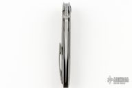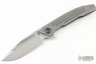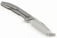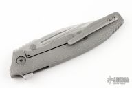 This Snafu 2.0 Integral Flipper by Peter Rassenti features a mirror stonewashed blade with notched thumbrest, fullers and flipper. The handle has a textured titanium frame and tip up clip, zirconium pivot and pivot collar. Rides on bearings, nice detent, lockup and blade seating. Comes with original box. Excellent condition.