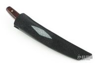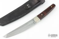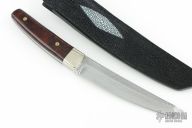 This knife by Jim Ort features a Raindrop Damascus blade with .205" blade stock and 1.059" blade depth, tapered tang construction. The handle has nickel silver bolsters, Ironwood grip and mosaic pins. Comes with a black leather sheath with rayskin overlay. Excellent condition.