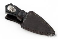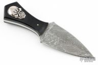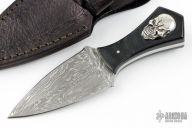 This Dagger by Jim Ort features a Damascus double edged blade with .171" blade stock and 1.586" blade depth, full tang construction. The handle micarta scales with skulls on the pommel. Comes with a black leather belt sheath. Has some light oxidation, otherwise excellent condition.