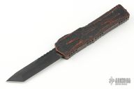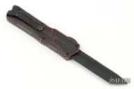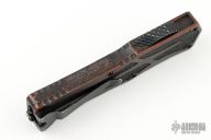 This Colossus by Heretic Knives features a black tanto blade with fullers and notched thumbrest. The handle has a breakthrough root beer aluminum frame with non-slip inlays, checkered thumb slide, stainless steel tip down clip. Comes with original box and lube. S/N 02271. Excellent Condition.
