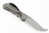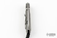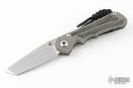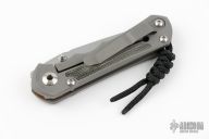 This Small Inkosi by Chris Reeve Knives features a tumble finished blade with dual thumb studs and notched thumbrest. The handle has a bead blasted titanium frame with black canvas micarta inlays over a single barrel spacer. The bead blasted titanium clip. Lanyard on pommel. Comes with original box, cloth, tools, lube, and COA dated May 23, 2019. Excellent Condition.