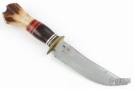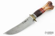 This Hunter by Jim Behring features a satin finished blade with .215" blade stock and 1.409" blade depth, hidden tang construction. The handle has a brass guard, black/brass/aluminu/leather/red spacers, pinned crotch stag butt. Comes with a zippered case. Has been used, has scratches and oxidation, otherwise good user condition.