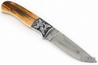 This Hunter by Master Smith Keith Kilby wears his Journeyman Smith mark. It features a drop point Damascus blade with .142" blade stock and .978" blade depth, full tapered tang construction. The handle has engraved stainless steel bolsters, mammoth ivory scales, nickel silver pins. Comes with a zippered case. Has some rust on the tang and bottoms of the bolsters, has some oxidation on the blade as well, fair condition. "71" on the tang