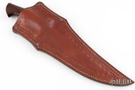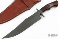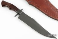 This knife by Journeyman Smith Erik Markman features a parkerized blade with false top edge, fullers and integral bolsters, .583" at the bolster and .277" at the makers mark, 1.872" blade depth, hidden tang construction. The handle has a blued steel guard, nicely contoured brown canvas micarta grip with amazing comfort. Comes with a hand tooled brown leather sheath. Excellent condition.