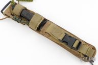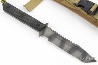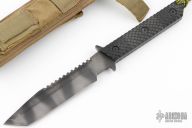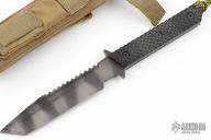 This BTSS from Mick Strider features a tiger stripe clip point tanto style blade with serrations on the spine, .250" blade stock and 1.301" blade depth. The handle black gunner grip scales over full tang construction with a lanyard hole. Includes nylon sheath with belt loop. Excellent condition.