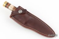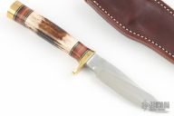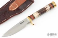 This Model 26 Pathfinder by Randall Made Knives is one of Randall's best-selling models. It features a drop point satin finished blade with notched thumbrest, .170" blade stock and .954" blade depth, hidden tang construction. The handle has a brass guard and butt, stag grip and black/brass/leather spacers. Comes with a brown leather sheath and stone. Excellent condition.
