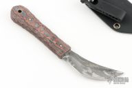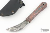 This knife by Steve Ryan features a splatter/distressed/acid finish blade with notched thumbrest, .180" blade stock and .987" blade depth, hidden tang construction. The handle has micarta scales and lanyard hole. Comes with a kydex sheath. Excellent condition.