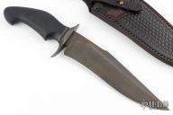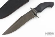 This knife by Samuel Lurquin features a black recurve blade with sharpened top edge, .224" blade stock and 1.937" blade depth, hidden tang construction. The handle has a black steel fluted guard and black G-10 grip. Brilliant handle contouring. Comes with a hand tooled black leather sheath. Excellent condition.