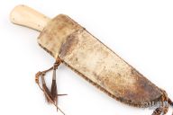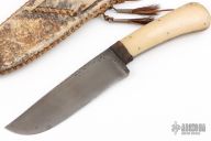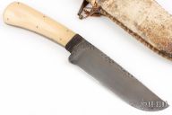 This knife by Master Smith Daniel Winkler features a drop point blade with a fileworked thumbrest and full tapered tang construction, .262" Blade Stock and 1.584" Blade Depth.  The handle has leather wrapped bolsters, and bone scales.  Includes a raw hide leather sheath. There is some light oxidations spots on the knife, excellent condition otherwise.