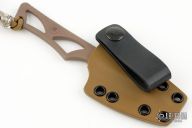 Enyo - a fitting name for this knife, Enyo, was an ancient goddess of war, acting as a counterpart and companion to the war god Ares. This companion knife can be worn around the neck or in a pocket / inside the waist band (IWB). The Enyo’s design makes it a comfortable everyday carry fixed blade with great ergonomics. Enyo is perfectly suited for daily cutting tasks, and is always ready to assist the user. The form fitted Kydex sheath. Pewter Spartan helmet bead on lanyard. This Enyo has a FDE coating (SpartaCoat – PVD – Tungsten DLC) and a FDE Kydex sheath.  Light scuffs are visible otherwise the knife is in excellent condition.