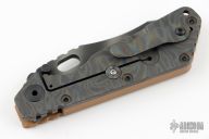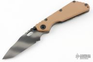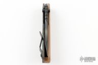 This Duane Dwyer Custom SMF features a tiger stripe chisel ground tanto blade with thumbhole and dual studs. Flame anodized titanium handle with a coyote G-10 front. Titanium clip. Notches on thumbrest, rear handle, and lockup. Includes Hinderer "Lock Bar Stabilizer" for maximum reverse lock retention. Nice detent, lockup and blade seating. Has slight up and down blade play. Has a couple light scuffs, excellent condition otherwise. Bos Heat treat S30V. Comes in a civivi zipper case.