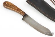 This Skinner by Swamp Fox Knives features a hand rub satin finished and blued blade, .118" blade stock and 1.158" blade depth, full tang construction. The handle has curly maple scales with brass pins. Comes with a brown leather sheath with belt loop. Excellent condition.