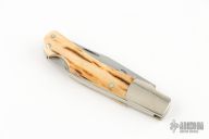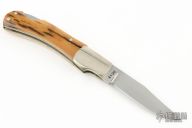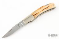 This lockback folder by B.J. Hoseck features a hand rub satin finished blade with nail nick. The handle has dovetail nickel silver bolsters and liners, mammoth scales, stainless steel backspacer. Nice lockup and blade seating. "4.96" on blade. Has some scuffs and scratches, great condition otherwise.