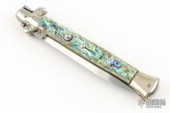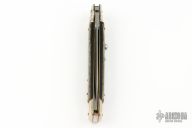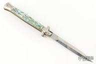 This Swivel Bolster by Walts and Latama features a wide (5mm) dagger ground blade with false top edge. The handle is comprised of nickel silver bolsters and pommel, abalone scales with black linen micarta backing, and steel push button/safety over brass liners and steel backspacer. Excellent condition.