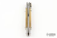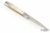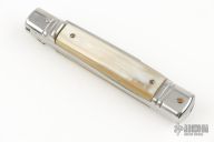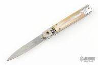 This Lever Lock Auto by G.O.M. Italy features a high polish blade, stainless steel liners and fluted bolsters, and honey horn scales. Perfect function. Has some light scratches, otherwise excellent condition. "Tiny 1/13/1956 - 2/23/2008 41of45" on the blade.