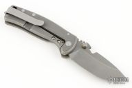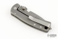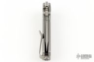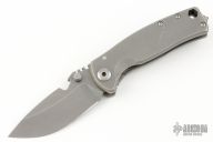 This knife by DPX features a stonewashed blade and bead blasted titanium handle with tip up stainless steel clip. Includes a brown leather sheath. Has scuffs/scratches otherwise the knife is in good condition.