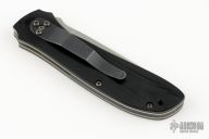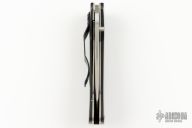 This Random Task Assisted Opening Linerlock Folder has a satin finished CPM 440V stainless steel wharncliffe blade with single thumbstud and notched thumb rest. Handle is black polished G10 with titanium liners, black G-10 backspacer, bead blasted titanium tip down clip, and lanyard hole. Has been resharpened, has some scratches, otherwise good user condition. Discontinued due to high cost of manufacturing, lots of hand done work.