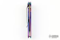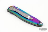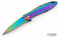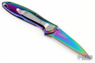 This Rainbow Leek Assisted Opening Framelock Flipper has a rainbow finished stainless steel drop point blade with dual thumb studs, flipper and notched thumbrest. Handle is rainbow finished stainless steel frame, with lanyard hole and safety lock. Stainless steel clip is tip up/ down reversible, RH carry. Excellent condition.