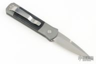 This Godson 700 Auto has a stonewashed 154-CM spear point, sterile blade. Handle is special grey aluminum with black G10 inserts and black finished tip up stainless steel clip. Has some scuffs, otherwise good condition.