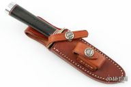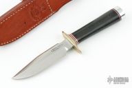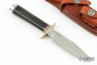 This is a miniature Model 1 - with all the features of the famous WWII full size Model 1. Stainless steel blade with top edge sharpened approximately 1 3/4 inches back from the tip, .173" blade stock and .818" blade depth, hidden tang construction. The handle has a nickel silver double guard, duralumin butt, and a black linen micarta grip with red/white/blue spacers. Comes with a brown leather sheath. In addition, the knife is authenticated by a coded transponder which cannot be altered. The transponder is inserted into the handle during construction with an encoded serial number matching the etched number on the blade. Only 1500 made. Serial number 289. Excellent condition.