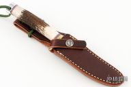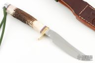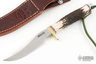 This Model 7-4.5 by Randall Made Knives features a satin finished blade with false top edge and notched thumbrest, .141" blade stock and .880" blade depth, hidden tang construction. The handle has a brass guard, stag grip and red/white/blue spacers, duralumin butt with lanyard hole. Knife comes with a brown leather sheath and original paper wrapping. New from maker!