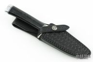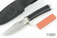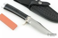 This Stanaback Special features a satin finished blade with sharpened top edge and notched thumbrest, .220" blade thickness and 1.159" blade depth, hidden tang construction. The handle has a nickel silver guard, duralumin butt, black linen micarta grip with black and duralumin spacers. Includes a hand tooled black leather sheath and original paper wrapping. New from maker!