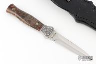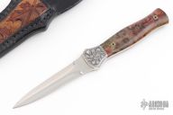 This Dagger by Don Lozier features a two-tone double hollow ground blade with mirror polished grinds and satin flats, .135" blade stock and .731" blade depth, full tapered tang construction. The handle has engraved stainless steel dovetailed bolsters done by "D.M.", burlwood scales with mosaic pins. Comes with a hand tooled brown/black leather sheath. Excellent condition.