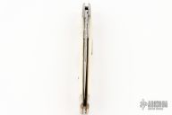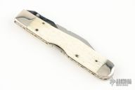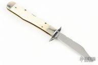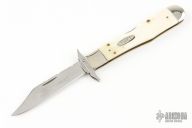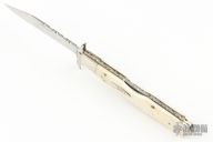 This D/A Auto Conversion Cheetah lock back folder from Case Knives features a clip point mirror polished blade with nail nick and fileworked spine. The handle has nickel silver bolsters, front and rear, and swing guard, and the scales are white jigged bone over brass liners, fileworked stainless steel backspacer. Has a couple light scratches, otherwise excellent condition.