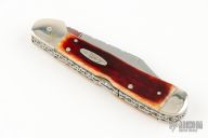 This 2-Blade Copperlock by Case Knives has been converted to a dual action automatic by Tank Fisher on both blades. It features polished blades with swedge and long pulls, fileworked blade spines. The handle is comprised of nickel silver double bolsters, amber bone scales with nickel silver push buttons, brass liners and a fileworked stainless steel backspacers. Has some light scratches, otherwise excellent condition.