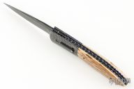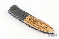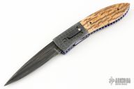 This custom automatic by Jim and Joyce Minnick features a Damascus blade with false top edge. The handle has Damascus bolsters, blued steel rockerbar with a diamond set in a gold bezel, mammoth ivory scales, fileworked and anodized titanium liners, fileworked and blued steel backspacer. Strong leaf-spring opening. Nice action, blade seating and lockup. Beautiful materials. Outstanding work with great attention to detail. The makers mark is set in the backspacer. Excellent condition. Comes with a Velcro case.