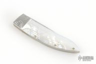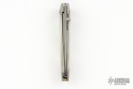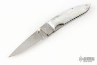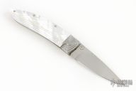 This linerlock folder by Koji Hara features a mirror polished blade with a single thumbstud with mother of pearl inlay. The handle has carved stainless steel bolsters, carved mother of pearl scales, a jeweled stainless steel liner and nickel silver liners, and a stainless steel backspacer. Beautiful materials and workmanship. Nice detent, lockup and blade seating. Excellent condition. Comes with a leather pouch.