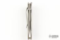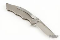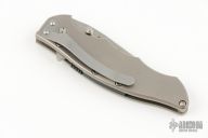 This Whisper 1625 (178 of 250) assisted opening flipper has a hand rub satin finished CPM440V stainless steel blade with dual thumb studs (thumb stud lock) and notched thumb rest. Handle is bead blasted titanium with non-slip inserts. Safety located above spacer spine. Bead blasted stainless steel tip down clip. Has some scuffs, otherwise excellent condition.